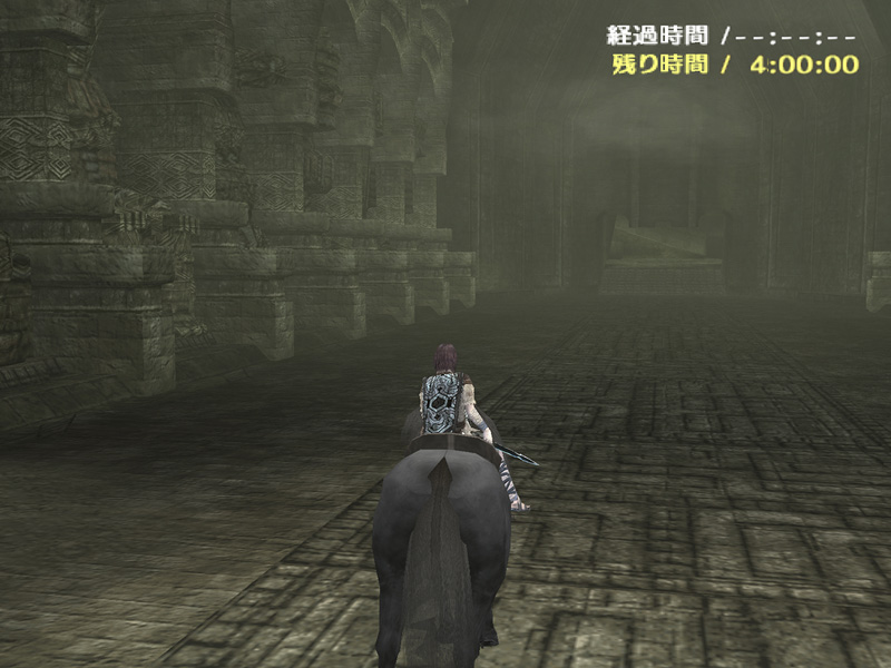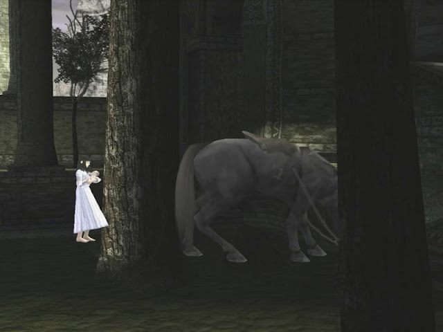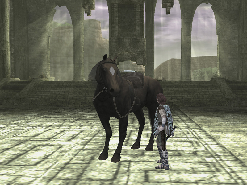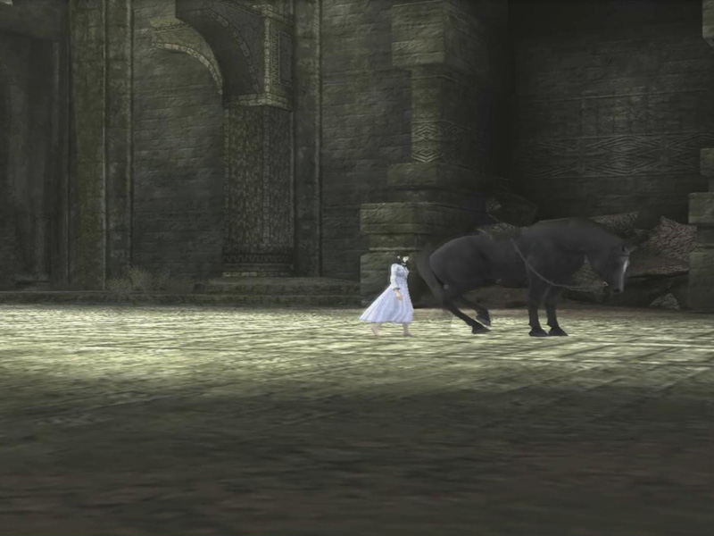 The first thing I wanted to check was if that 'Rook' type structure could be damaged? So I ram Cenobia into it a few times but nothing happens... so that answers that! Next, I try to ram a normal column, but it seems without Wander, Cenobia can't knock it over by itself. We need Wander to shoot the colossus so a program flag is set which then gives the game 'permission' for Cenobia to ram it again and knock it over. Hmmm, so there is nothing much I can do 'being' Cenobia. All I can do is run around the arena and jump over the aqueducts. So I continue running around and make my way back to Wander and Agro on the stairs that lead up to the arena. Here something strange happens! I try to ram Agro but it appears I hit an invisible wall, so I try from the side instead and as Cenobia jumps over Agro we hear her neigh! When I turn Cenobia around again Agro is frozen mid-way between a rearing motion and Wander is nowhere to be seen? At just the right angle you can see the reins are stretched out but I couldn't find Wander... Well at least something interesting happened at the end 😉.