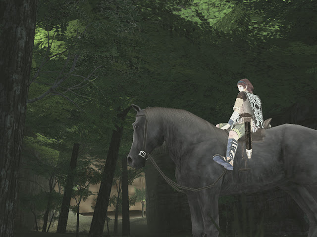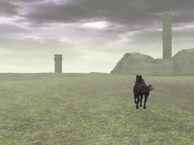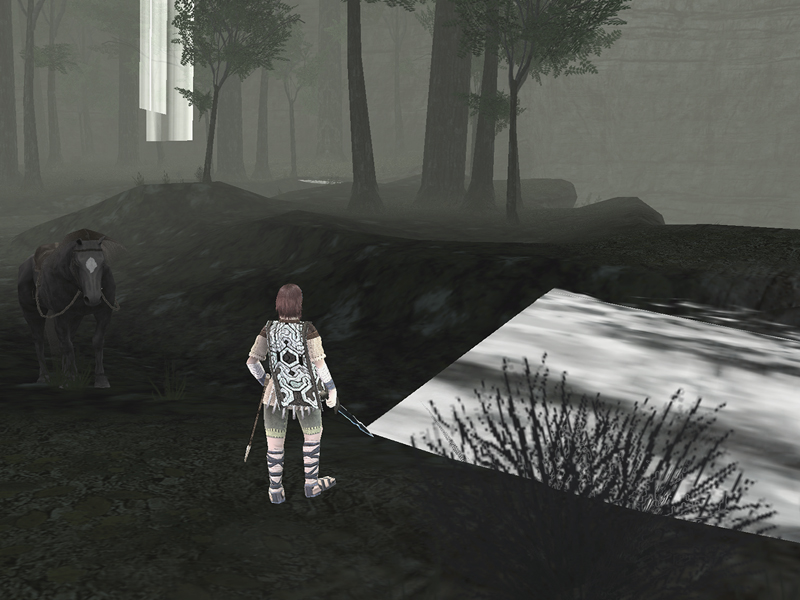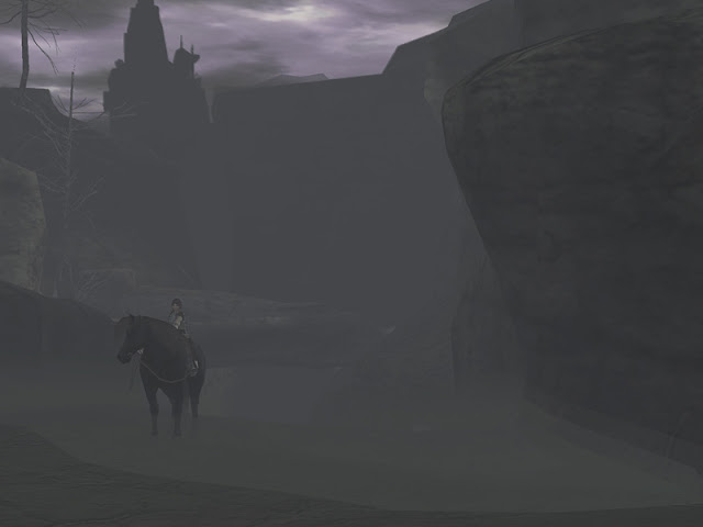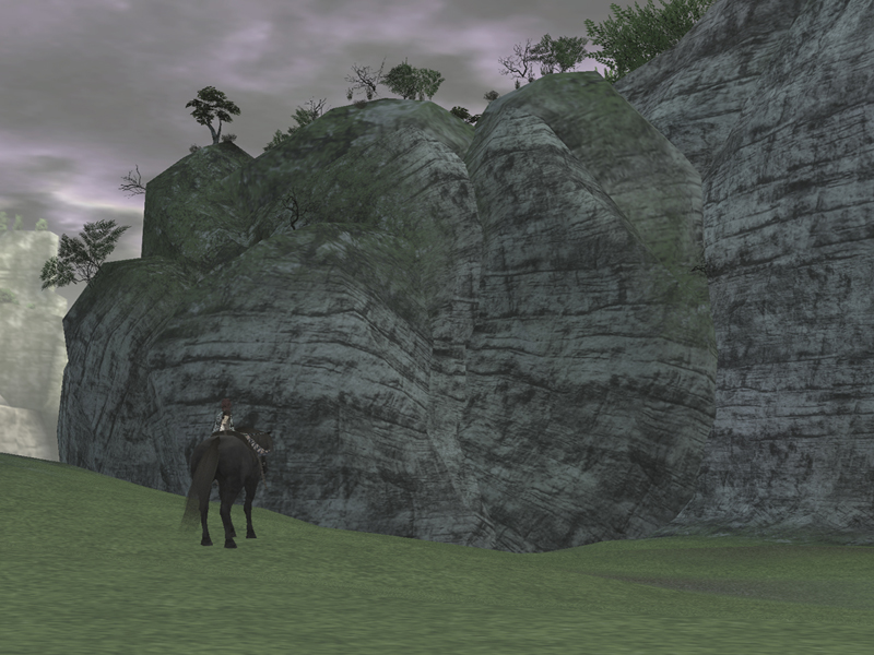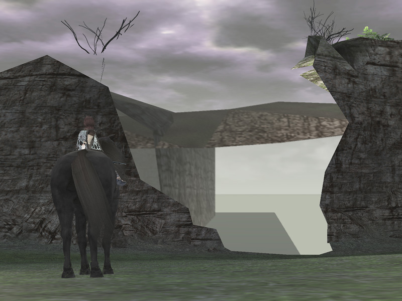Also, Wander's head is normal size so he looks very odd here! There is a separate model for Wander's head and in this video I had only found Wander's body position co-ordinates. So Wander jumps down from the bridge and opens the chute... which compared to Wander's enormous frame looks like a small tablecloth! Once he mounts Agro the jumping stops and I ride towards the South changing Wander's body size from large to 'colossal' and then 'ridiculous'! You will notice at 1:35 in the video I also increase Agro's size until at the end both rider and horse have returned to their original sizes.