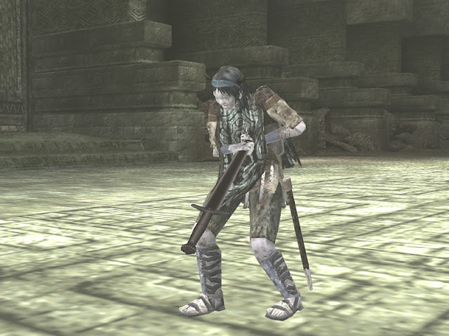I named this video 'I, Cenobia' based on the famous book by English writer Robert Graves 'I, Claudius' from 1934, and to a lesser but more interesting extent 'I, Borg' an episode from Star Trek: The Next Generation (the 23rd episode from the fifth season). I shift the camera to Cenobia, and we see for the first time ever a new perspective from Cenobia's point of view. The camera is offset to the left of the colossus and then it starts to move. Cenobia then leaps down the broken stairs of the ancient temple but instead of running towards Wander, I now have control - so I direct it to another area of the arena.