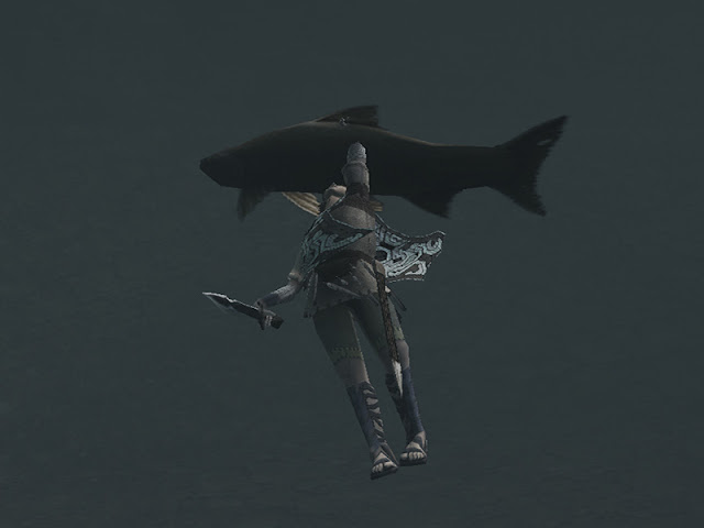 Like Wander's head model in the above video the lizard's tail is likewise a separate model, so it looks like a tiny appendage sticking out of this giant lizard. I make the lizard even larger until it starts flashing on and off... indicating that I have made the lizard way too large as at times you see only the tiny white tail floating above the floor. Finally I put the poor reptile out of its misery with a quick shot from my bow, the lizard falls then starts to slowly sink into the floor, while this is happening I increase its size again until it's truly enormous - colossus sized now! Eventually the huge bulk of the creature sinks into the floor leaving only the small glowing tail for Wander to pick up.