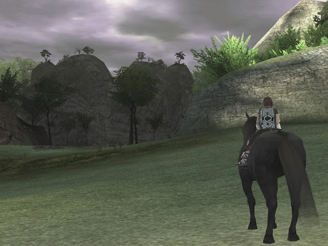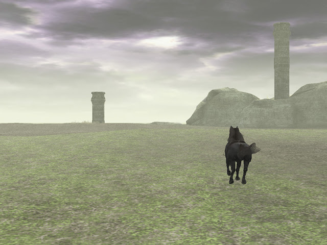 We start at the windy Eastern Bluff save shrine. I dismount Agro then move Wander's camera to a passing hawk. From then on I just recorded the video of the hawk flying over that area - which includes the Stonehenge structure. I even added the music we hear in the cutscene 'The Farthest Land'. You will notice that at times the scenery will become darker and sharper - this is when the hawk is aligned with Wander - the 'Player_A camera code' is being activated, so the game thinks it's Wander, not the hawk that is the primary. Hard to explain, but it's the most simple explanation I can give. At other times, you see the hawk following Agro and Wander as they ride across the vast green expanse, only to then turn away and continue on its programmed flight path.