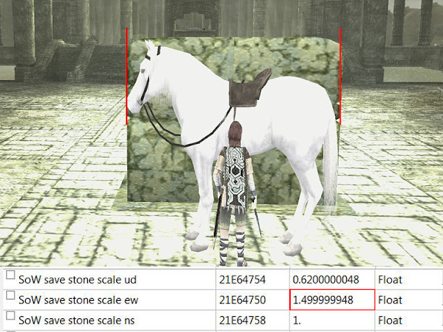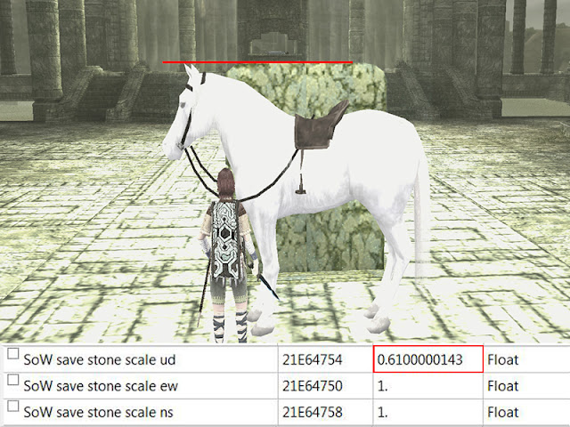 Back in 2009 I published my measurements of the colossi on the Playstation 2 forums, but these values were based on Wander, and for that I just made a guess as to his height, which I speculated was 5 feet 7 inches (or 170cm)... at the time I wasn't that clued into how the memory editor worked with the game, so this initial value was used to estimate the height of all the colossi, and as such the error was compounded. Note: The Team Ico wiki's measurements are also based on these erroneous measurements, but I've been in contact with one of the admins and he has agreed to update the measurements to the following correct values.