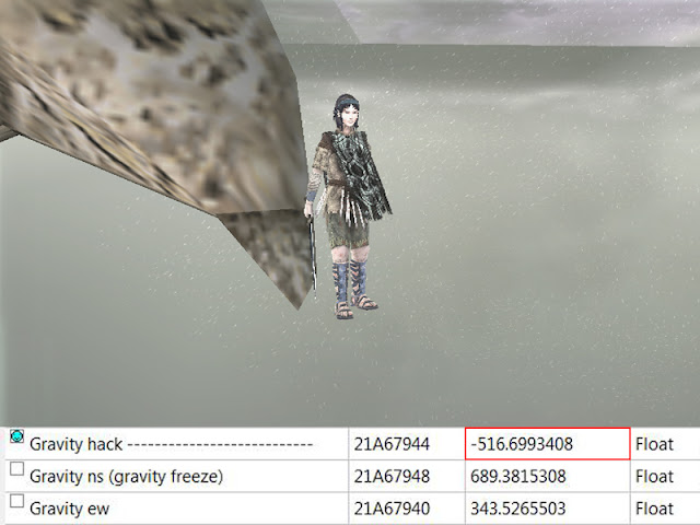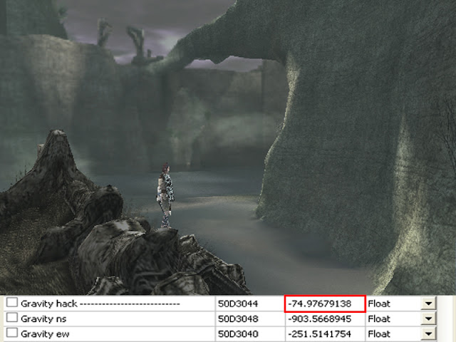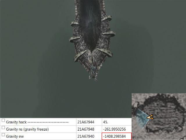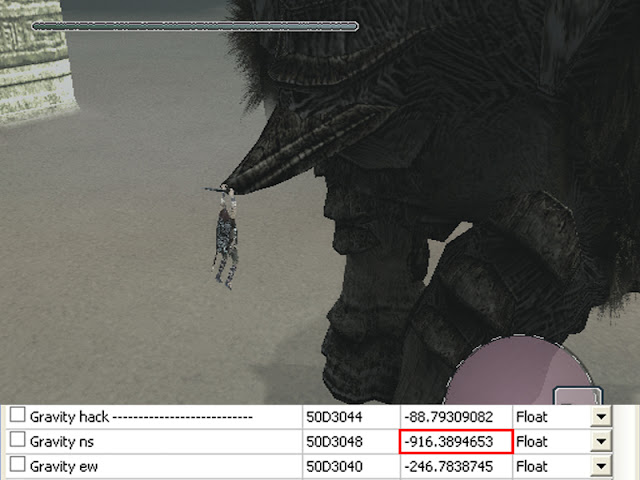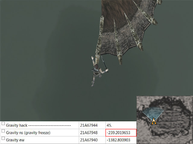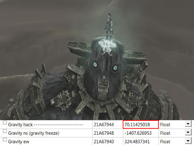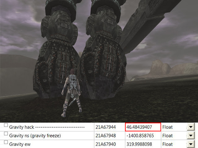 Below I have again used my memory editor to work out the height of Gaius (#3), just to make sure you can see the process used above with Quadratus. I first freeze the colossus once it's standing as upright as it gets, that is as it walks it shifts slightly from side to side which effects its height. I wait until it's at its maximum height when I freeze it, then I take my measurements, at its feet then on top of its head.