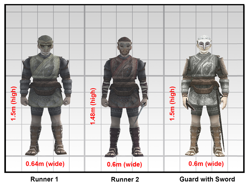 Note: Lord Emon is actually a little shorter than Wander, perhaps due to his advanced age? But his guards are also much shorter than a modern sized person, the highest being 1.5m (or 4.9 feet) tall. So it seems all the characters in Shadow of the Colossus are little people, much smaller than modern humans - why this is so is up for conjecture, perhaps this story is set many millennia in the past? By examining the stage of technological development it appears to be around the 8th century AD, i.e. soldiers rode around on horses, sword, shields and arrows were the weapons of choice - no firearms are evident yet and they appear to have leather armour.